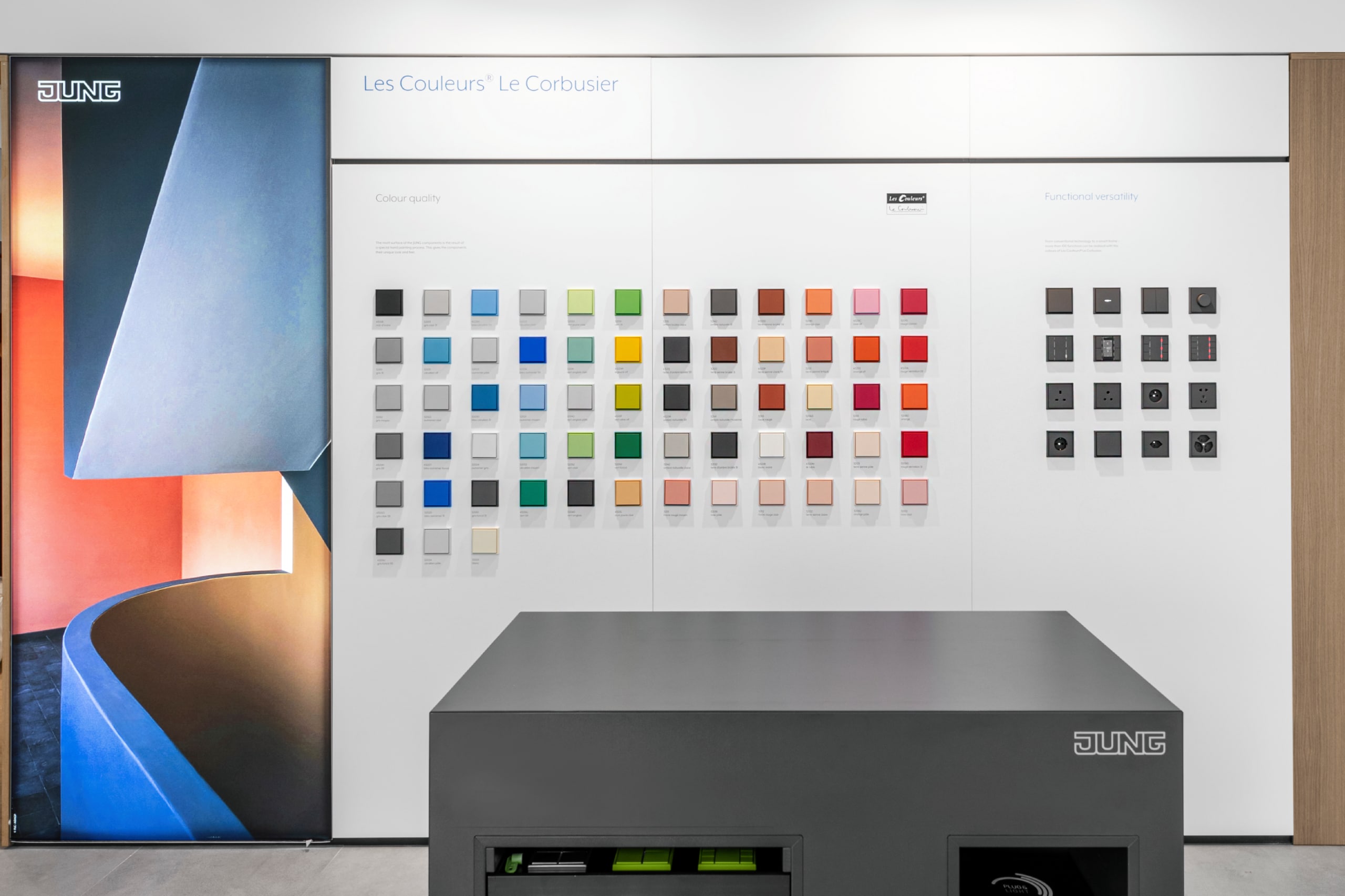 Šajās telpās apmeklētāji var paši izmēģināt aprīkojumu un izjust to, ko nozīmē tehnoloģija, kas vienkāršo ikdienu un kalpo lietotājam – sākot ar balss vadību un biometriskām durvju slēdzenēm un beidzot ar automātiski vadāmu apgaismojumu vai mūziku, kas lieliski piemērota virtuvei. “JUNG Showroom” neapšaubāmi ir vienīgā šāda veida demonstrāciju telpa ne tikai Lietuvā, bet arī Austrumeiropā, kas apvieno tik lielu integrētu viedo sistēmu koncentrāciju, kas tiek kontrolēta no vienas centrālās sistēmas. Jūs varat arī redzēt lielāko produktu ekspozīciju tiešraidē – no dinamiskā Les Couleurs® Le Corbusier® klāsta līdz vēsturiskajam LS1912, no moderniem KNX kontrolieriem līdz citiem viediem risinājumiem, kas paredzēti ērtai un skaistai dzīvošanai.